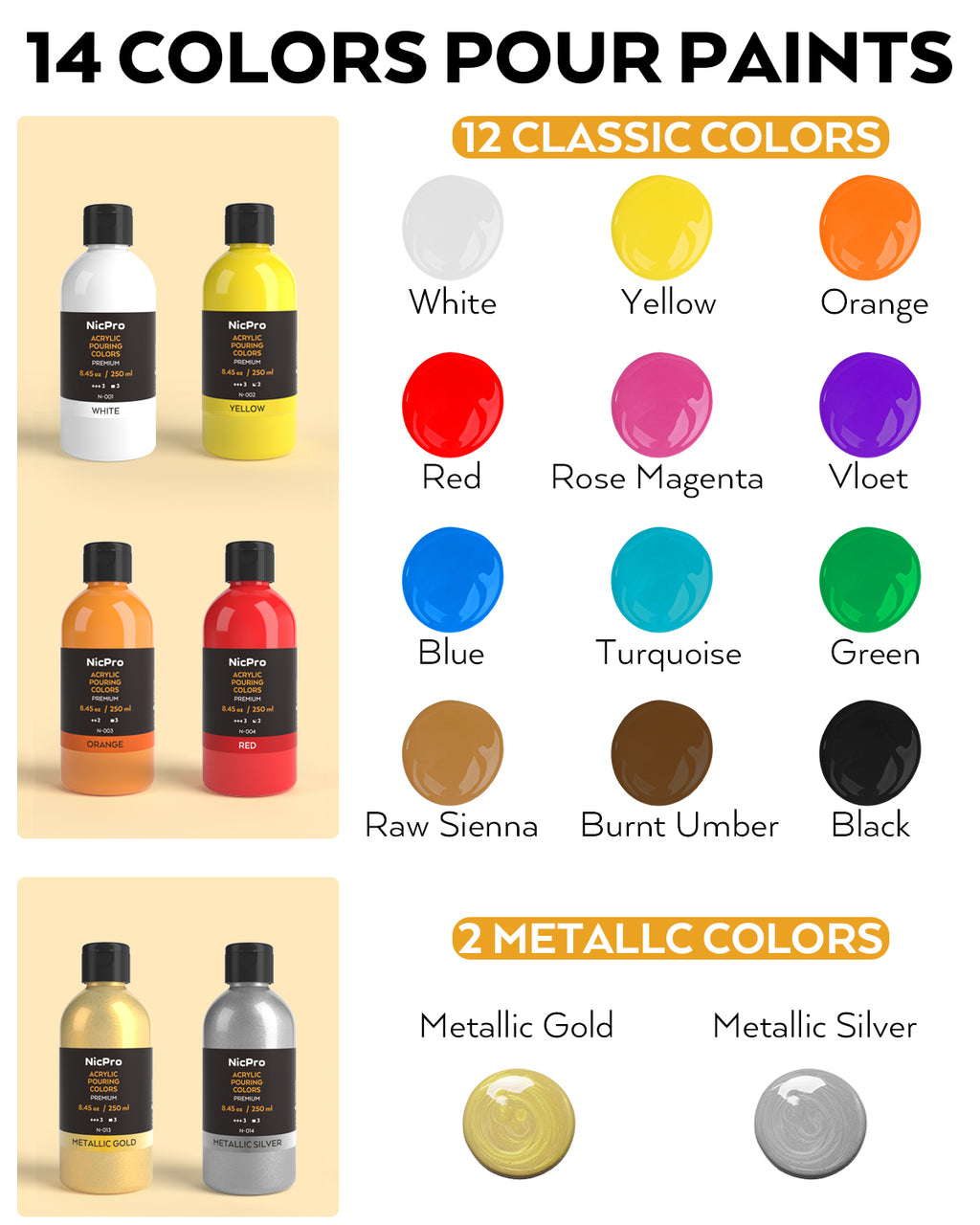 - Large Acrylic Pour Paint: The acrylic pouring paint kit includes 12 classic colors and metallic gold & metallic silver. Large Volume 8.45 oz / bottle.This ready to pour acrylic paint has the right ratio of pouring medium already mixed in, just start pouring