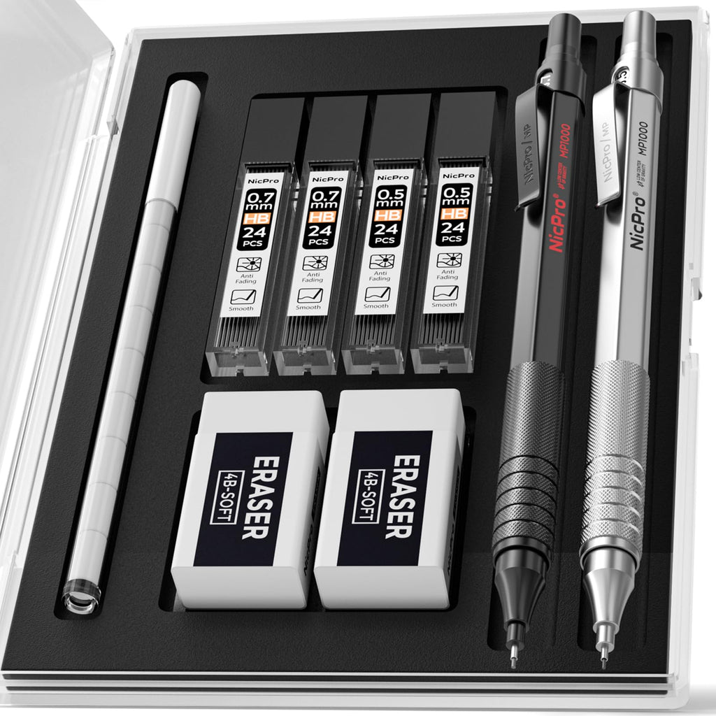 - 【Nicpro MP1000 Series Pencil 0.5mm & 0.7mm】:Come with 2pcs full metal body mechanical pencils (0.5 silver pencil & 0.7 black pencil) with 4 tube of HB pencil lead (0.5mm & 0.7mm), 2pcs 4B-soft erasers, 9pcs mini cap eraser refills in a sturdy storage case