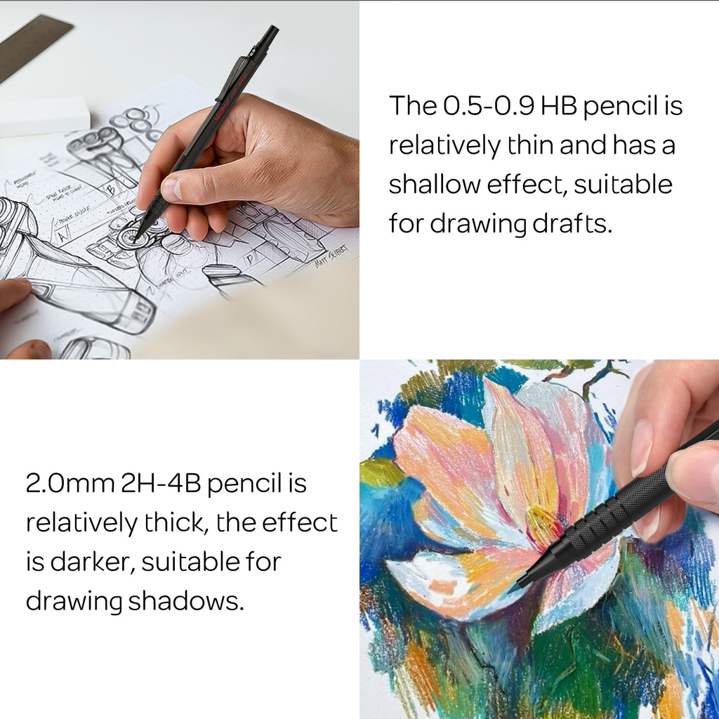 The full-metal body provides ideal weight balance for fatigue-free writing and drawing. It brings you more effective and high quality tasks. Extra 2pcs lead sharpener are provided for the 2.0 lead to keep the fine point as they dull.