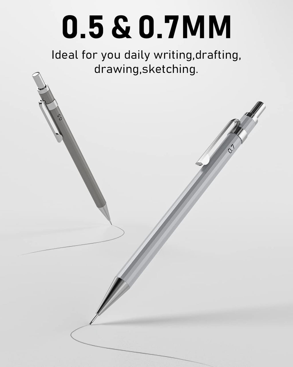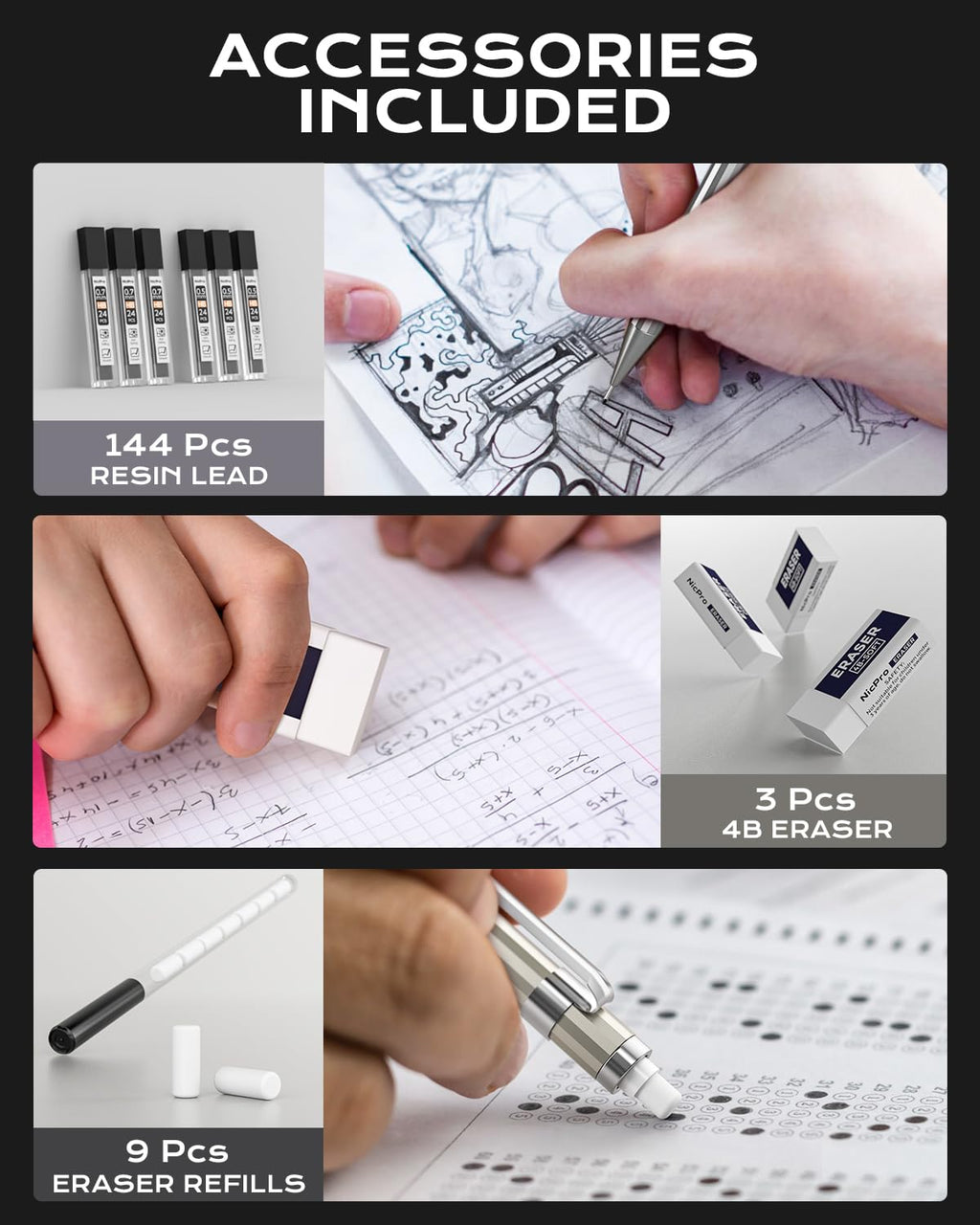 - 【Nicpro MB1000 Mechanical Pencil Set】Come With 8 PCS mechanical drafting pencils ,in 4 elegant metallic color, including 0.5 mm & 0.7 mm ,6 tubes of HB lead refill : 0.5mm & 0.7 mm (24pcs/tube), 9pcs of cap eraser refills, 3pcs soft 4B erasers and a sturdy mechanical pencil case