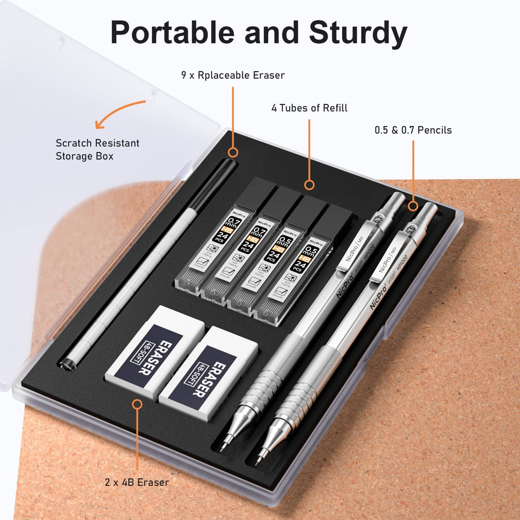 - 【Nicpro MP1000 Series Pencil 0.5mm & 0.7mm】:Come with 2pcs full metal body mechanical pencils with 4 tube of HB pencil lead (0.5mm & 0.7mm), 2pcs 4B-soft erasers, 9pcs mini cap eraser refills in a sturdy storage case
