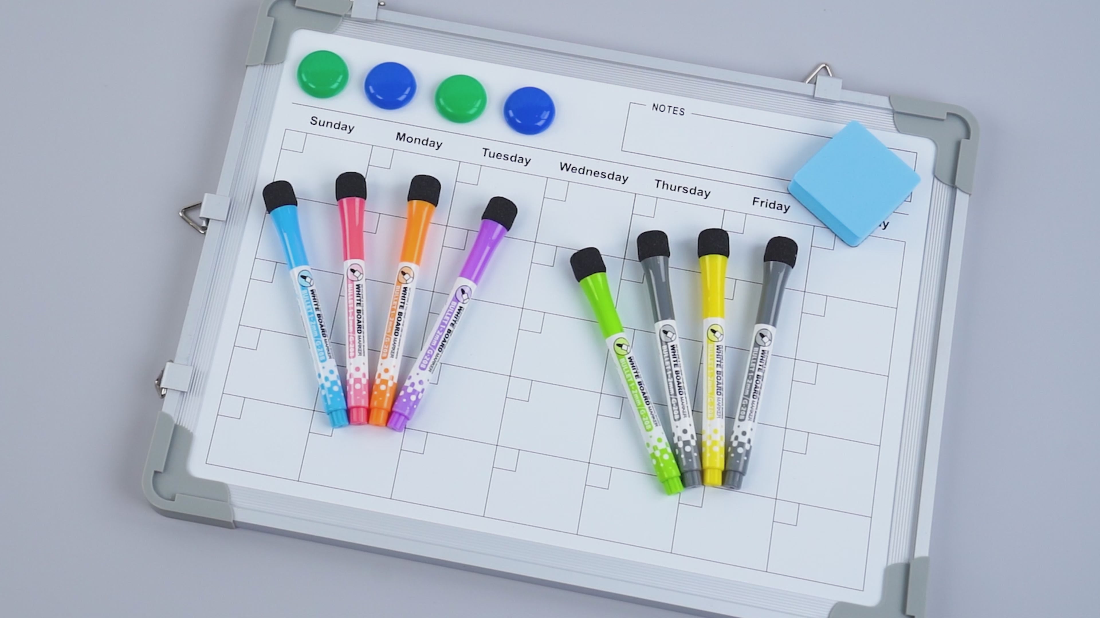 - 【VALUED PACKAGE】: Come with 1 x Double-Sided Magnetic Dry Eraser Board (12'' x 16'', Front: Calendar, Back: Blank), 8 x Water-Based Pen (black x 2, red x1, blue x 1, yellow x 1, green x1, purple x 1, orange x 1), 4 x Magnets, 1 x Dry Eraser for Cleaning Meets your various different needs!